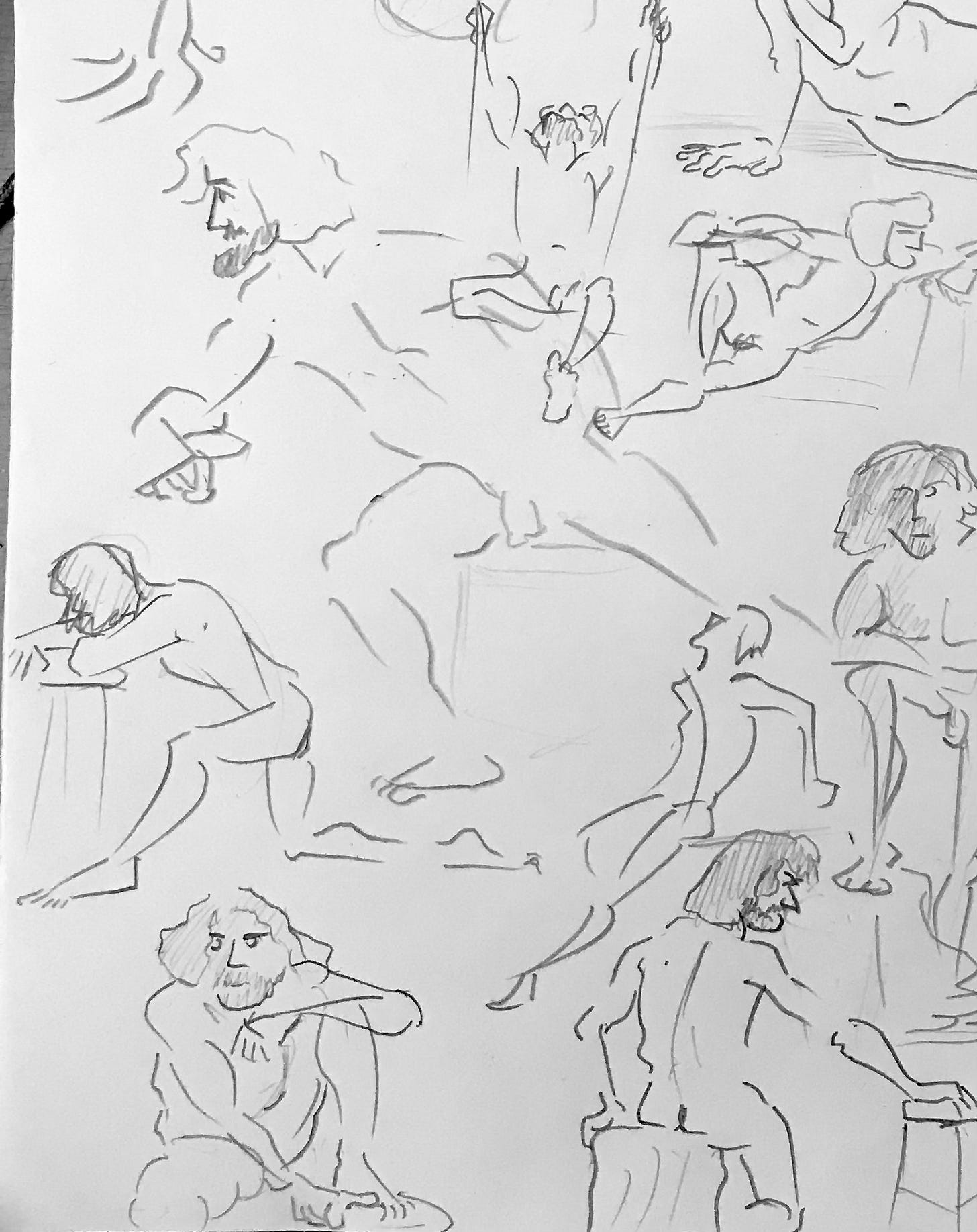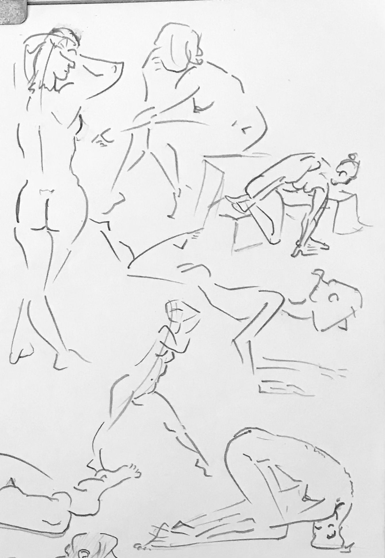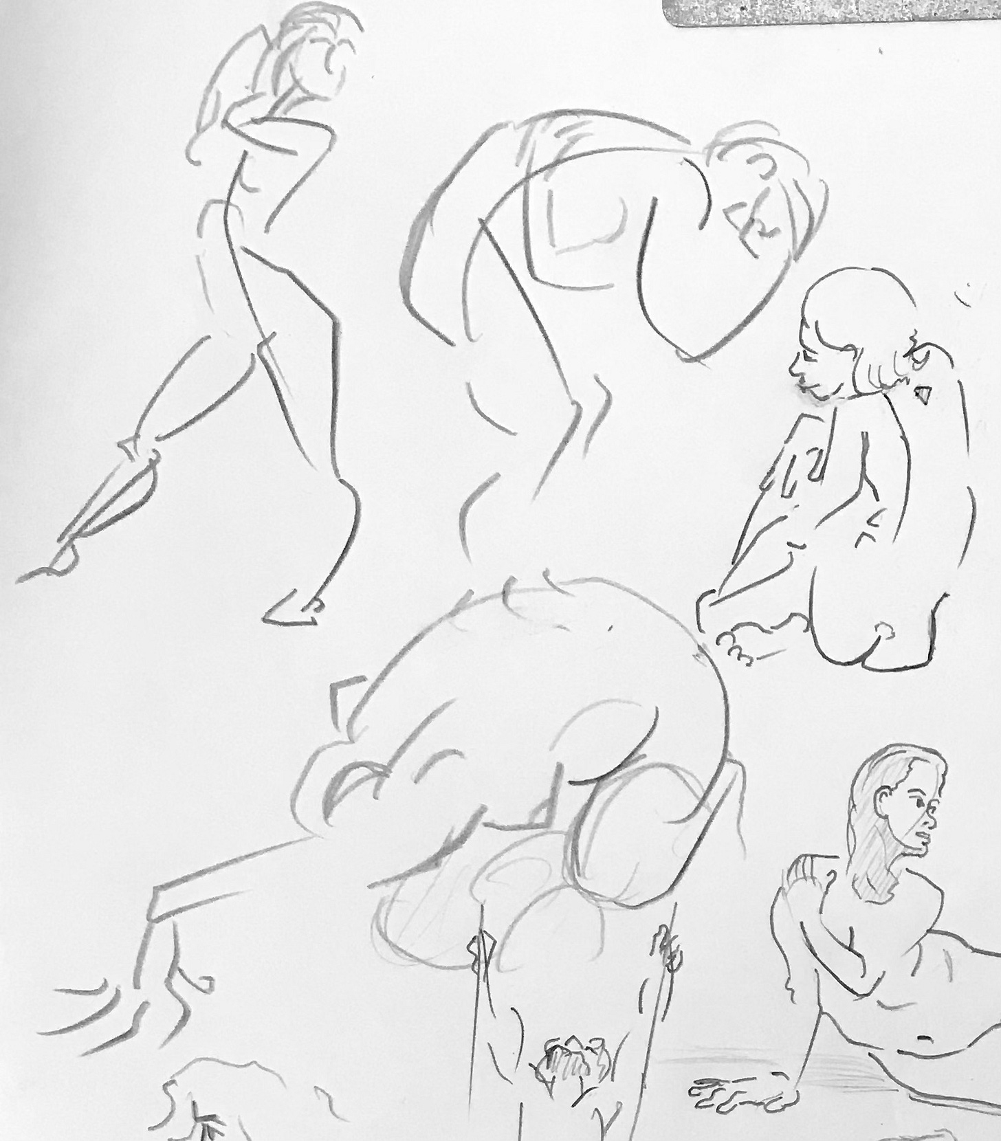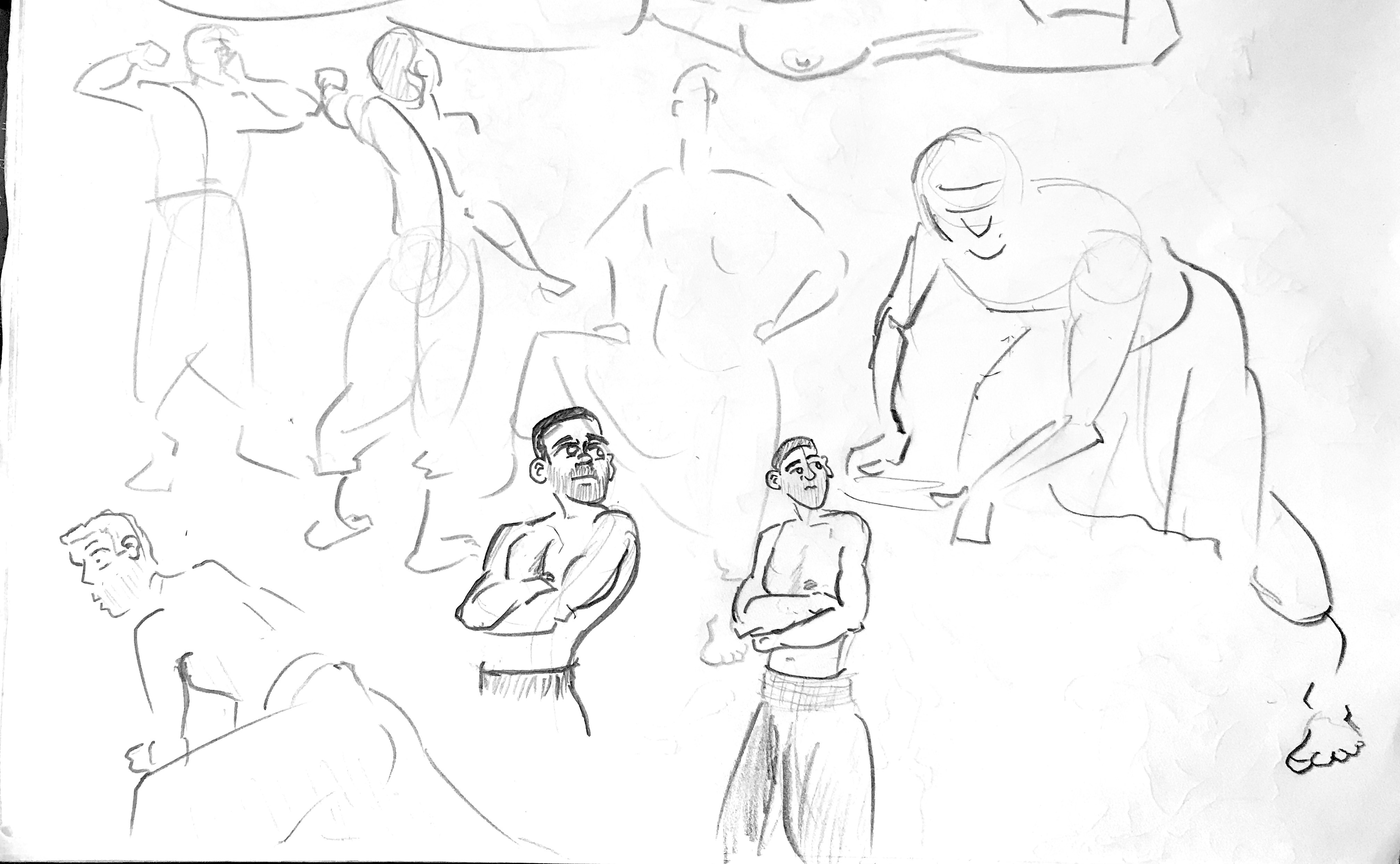 I’ve been continuing to focus on line economy (using as few lines as possible) and rhythm (creating a sense of visual flow) utilizing my “open line” technique. Ultimately, the human body can be effectively represented with a series of sharp angles (bones/joints) curves and straights. From there, and just a matter of determining which of those elements is necessary to effectively communicate what the body is doing. If I have more time, then I can connect the dots with additional lines or shadow. (The rest is gravy.)