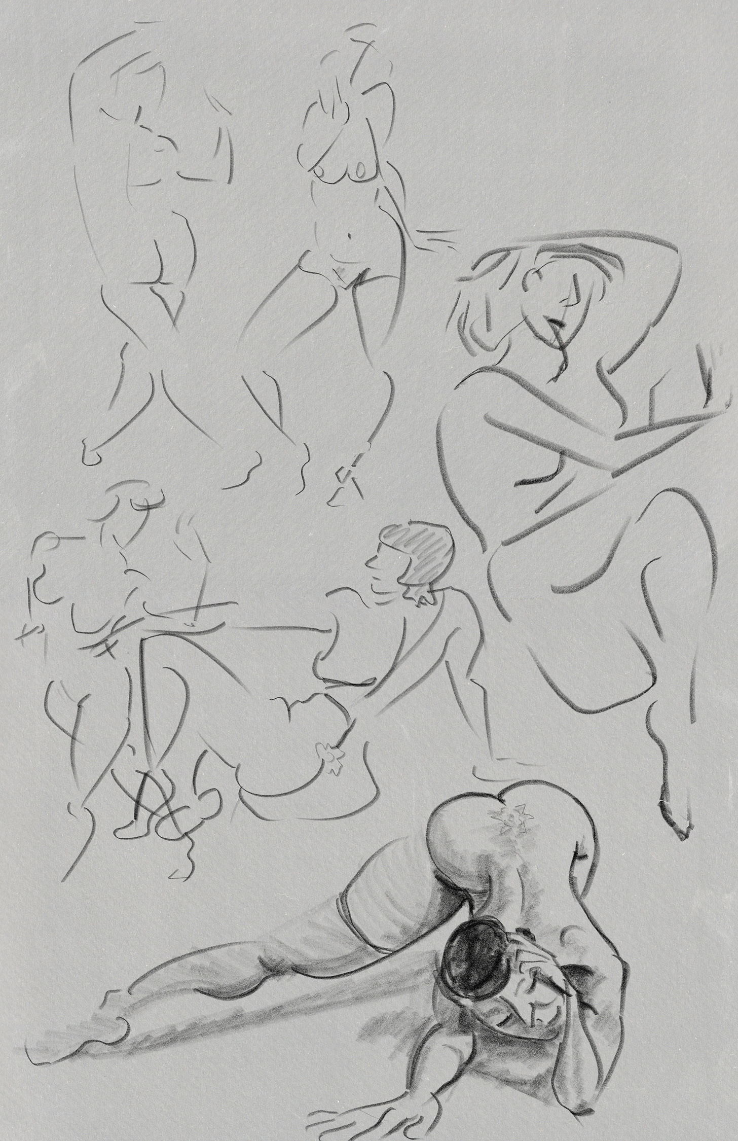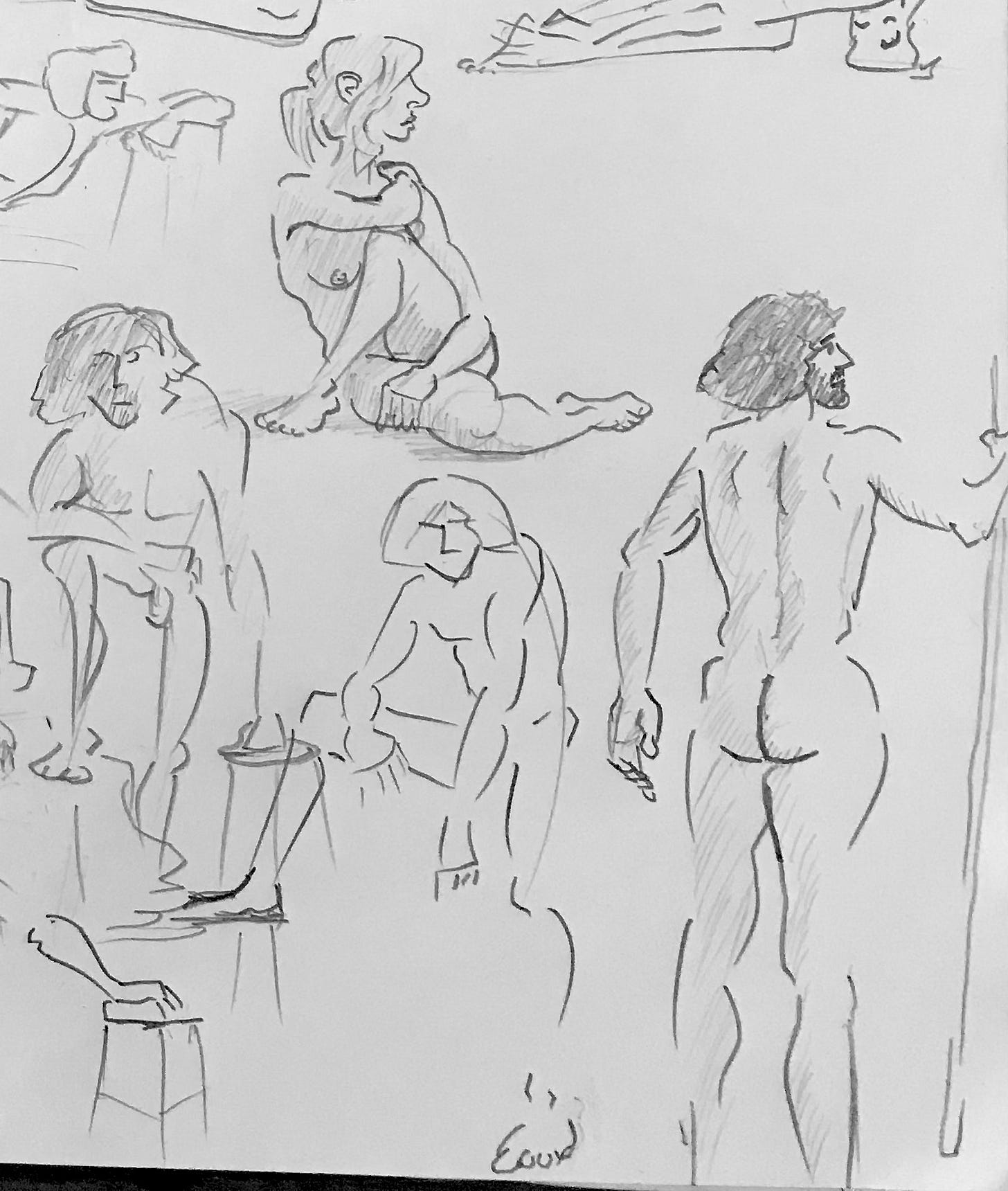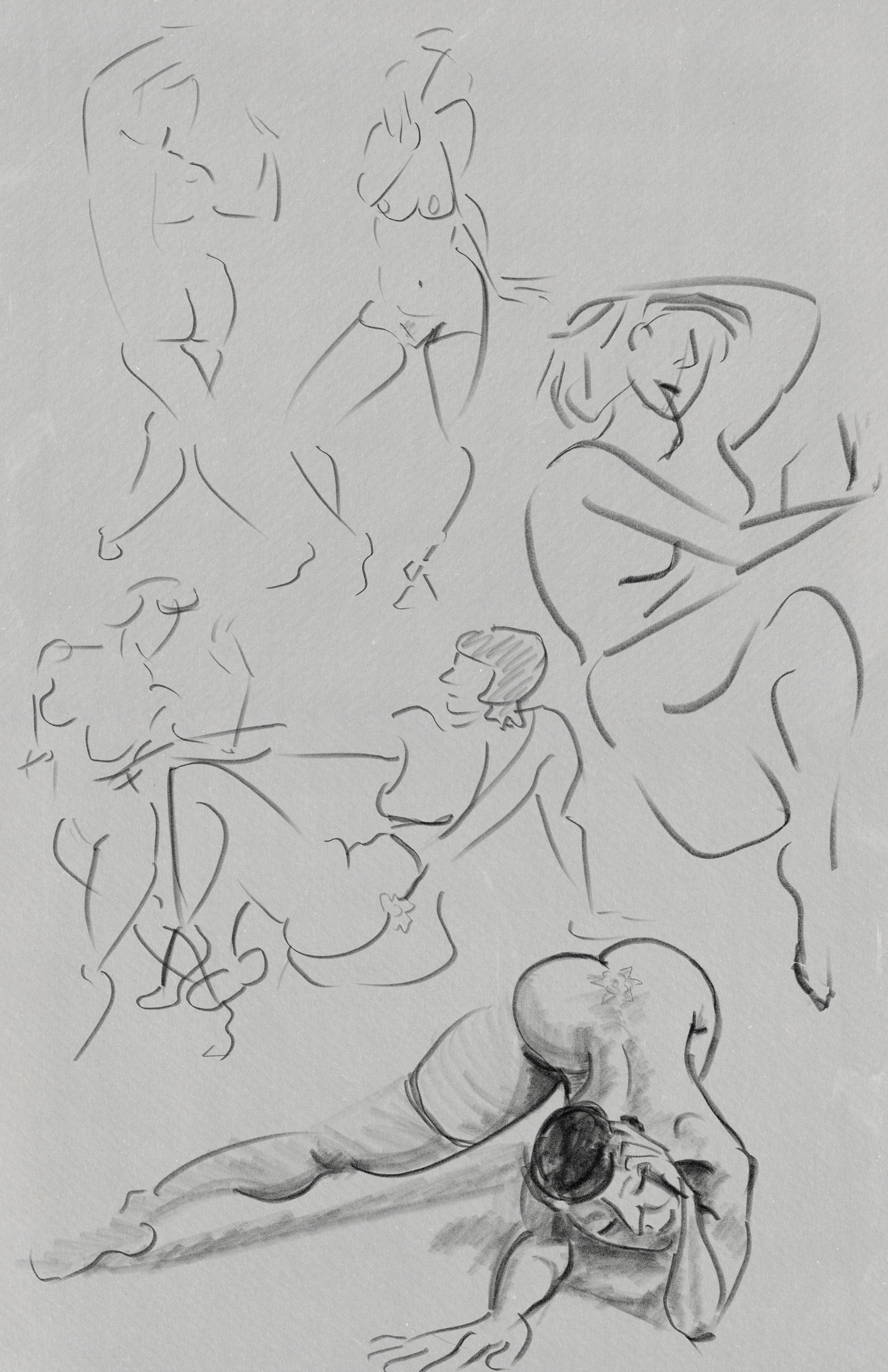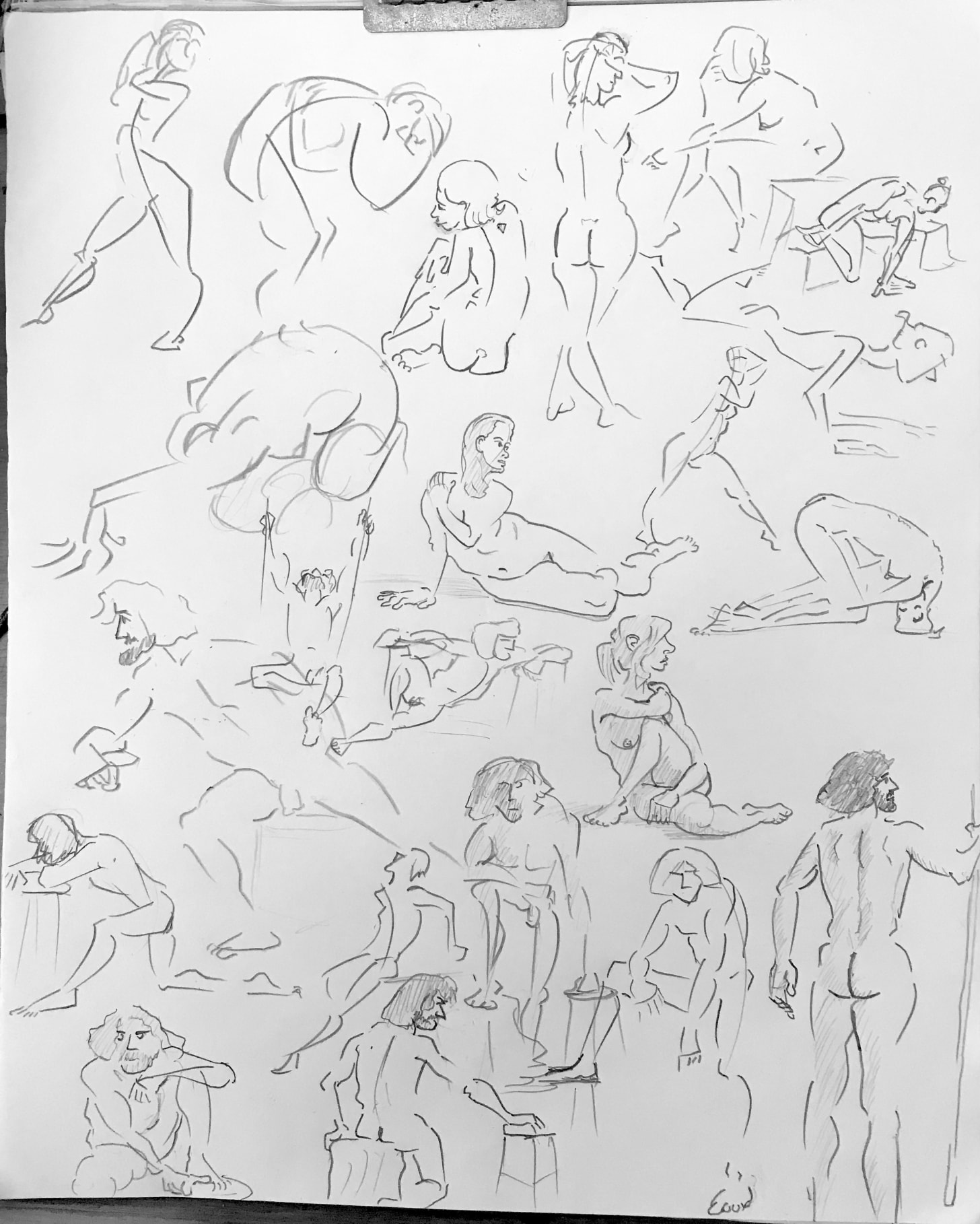 I’ve been continuing to focus on line economy (using as few lines as possible) and rhythm (creating a sense of visual flow) utilizing my “open line” technique. Ultimately, the human body can be effectively represented with a series of sharp angles (bones/joints) curves and straights. From there, and just a matter of determining which of those elements is necessary to effectively communicate what the body is doing. If I have more time, then I can connect the dots with additional lines or shadow. (The rest is gravy.)