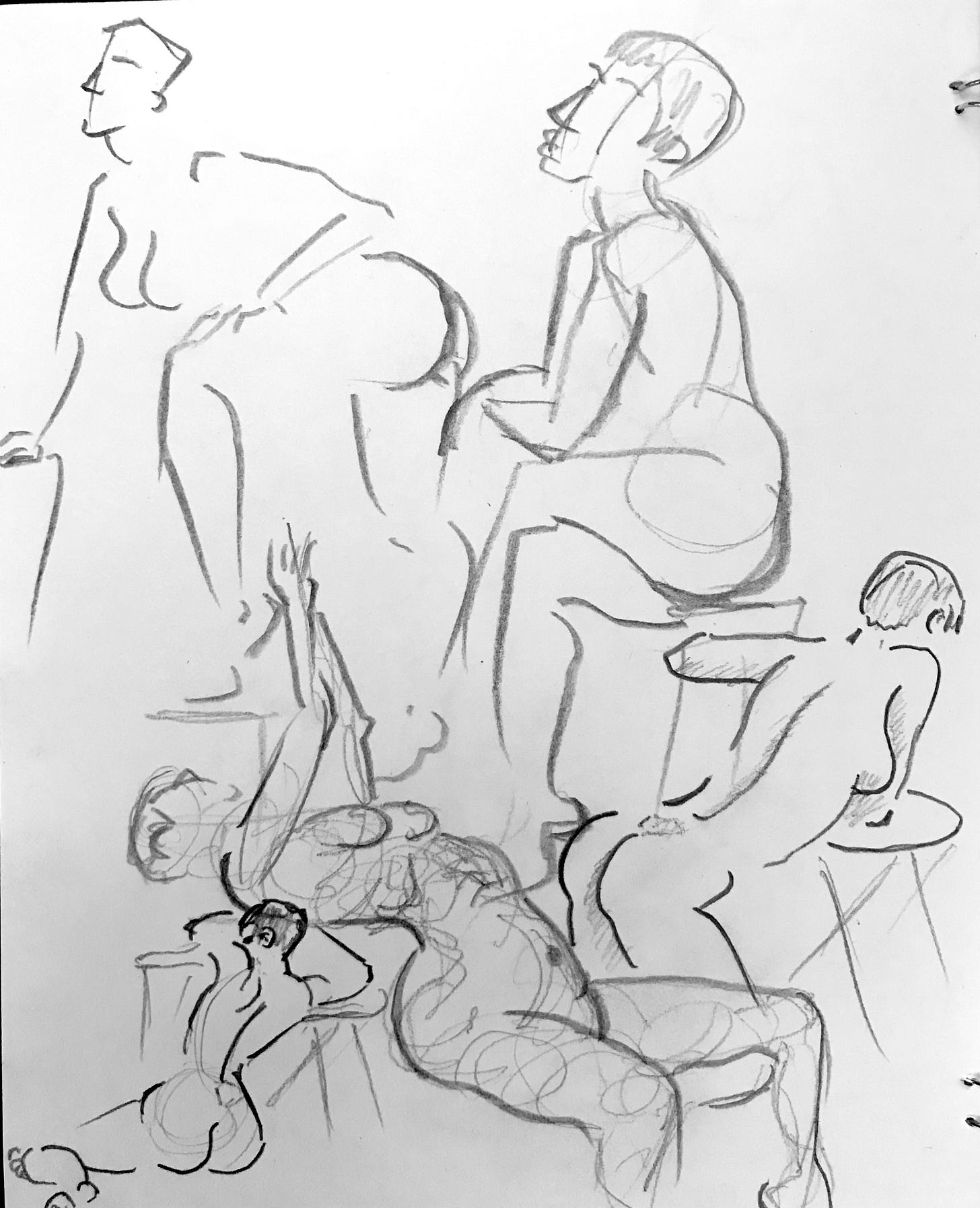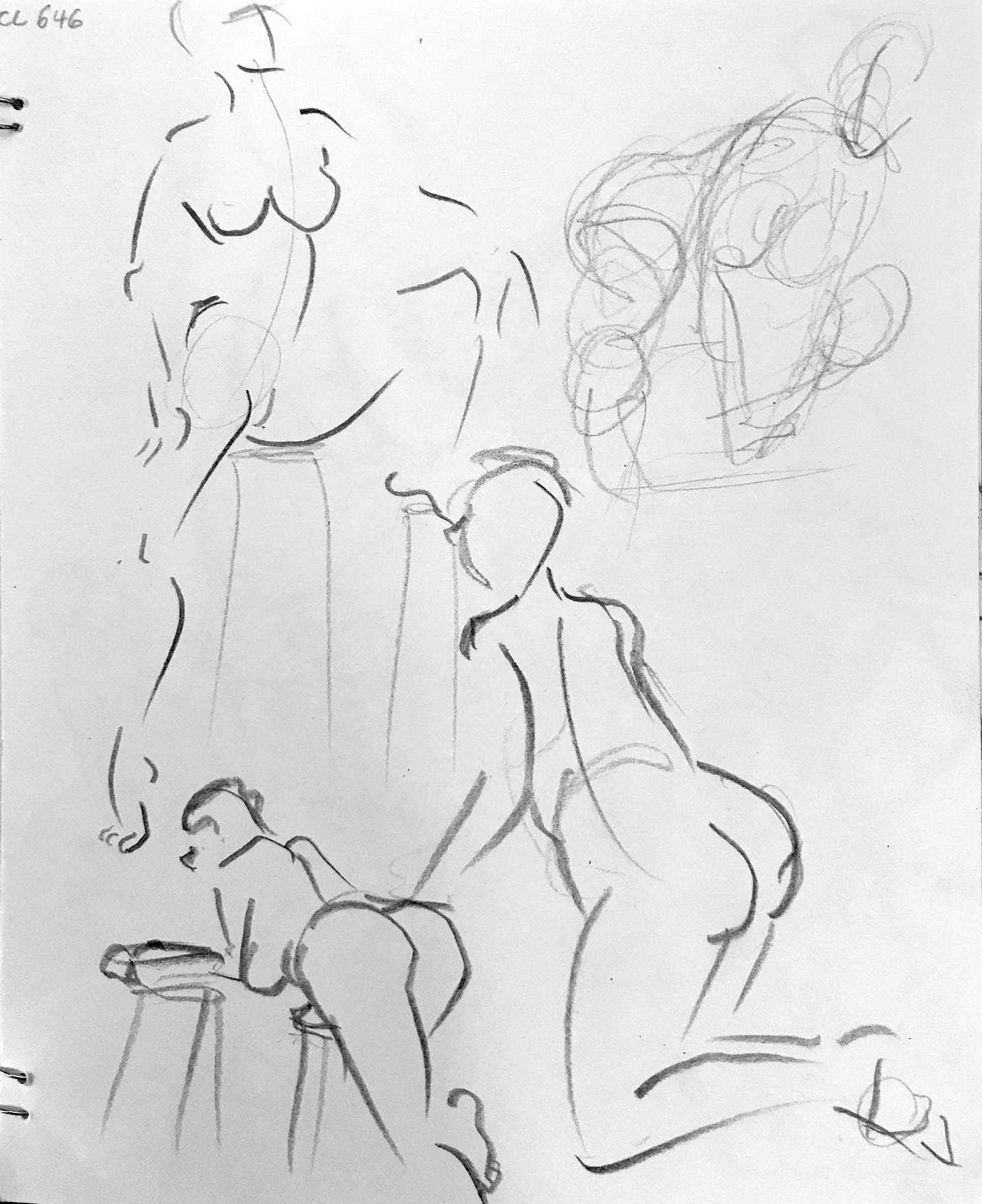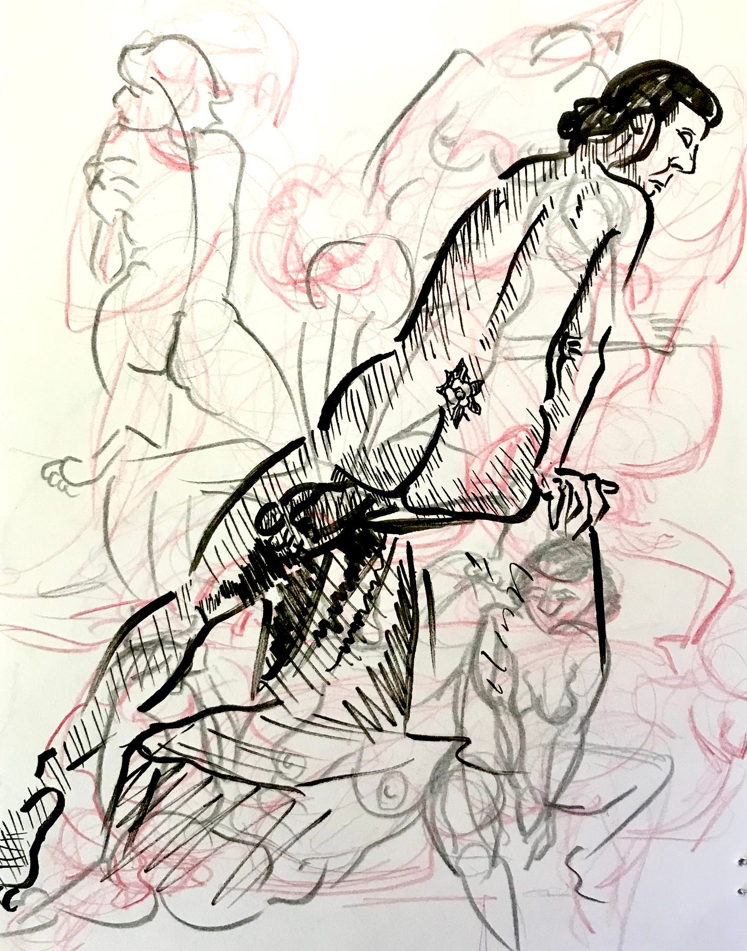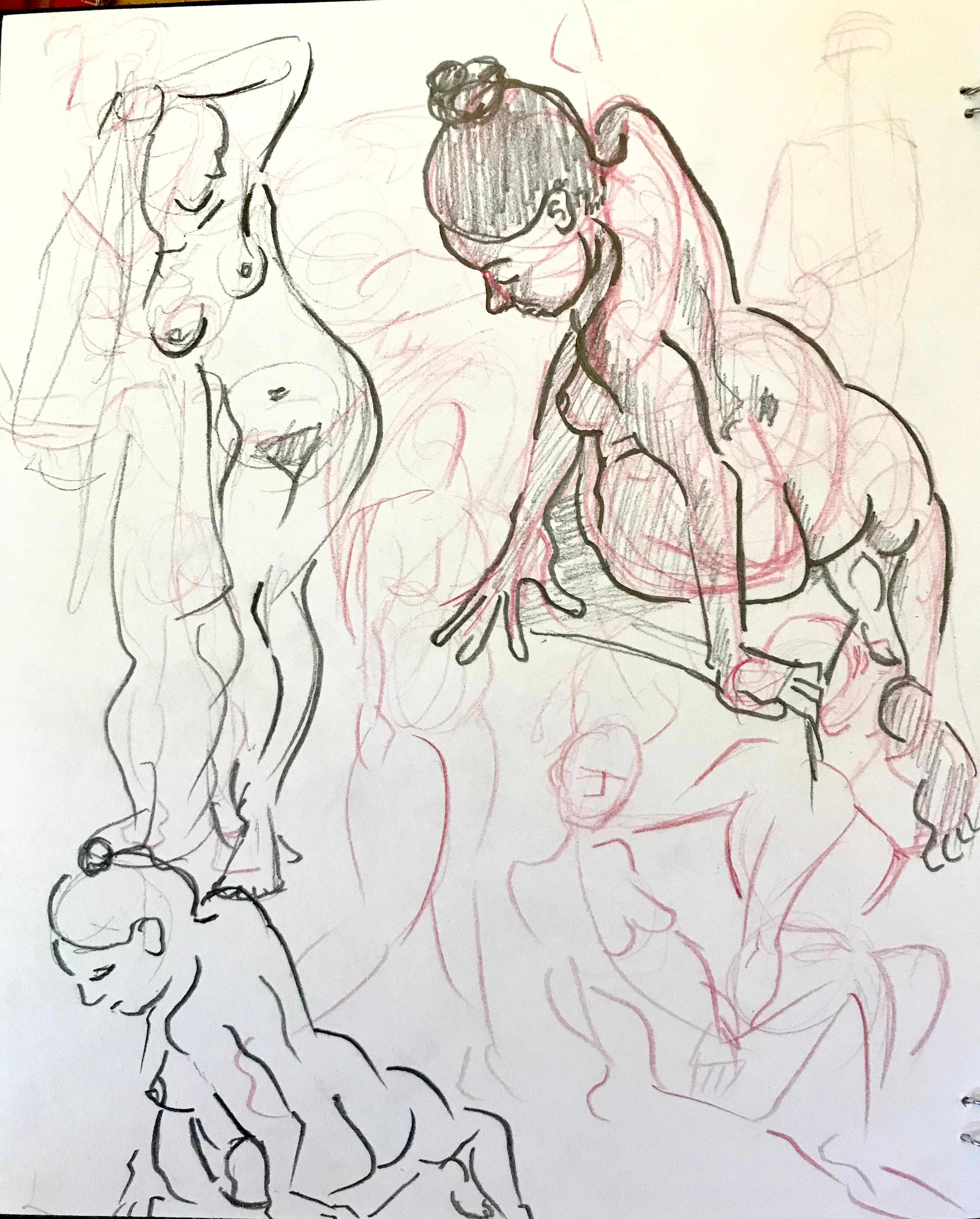 From video 648, I did another layered session, except this time I placed all three pose lengths on the same page: one, two, and five minutes with red, graphite, and ink - respectively. Maybe it’s just me, but there’s something fun and expressive about picking the forms out of the visual noise and letting them get lost simultaneously.