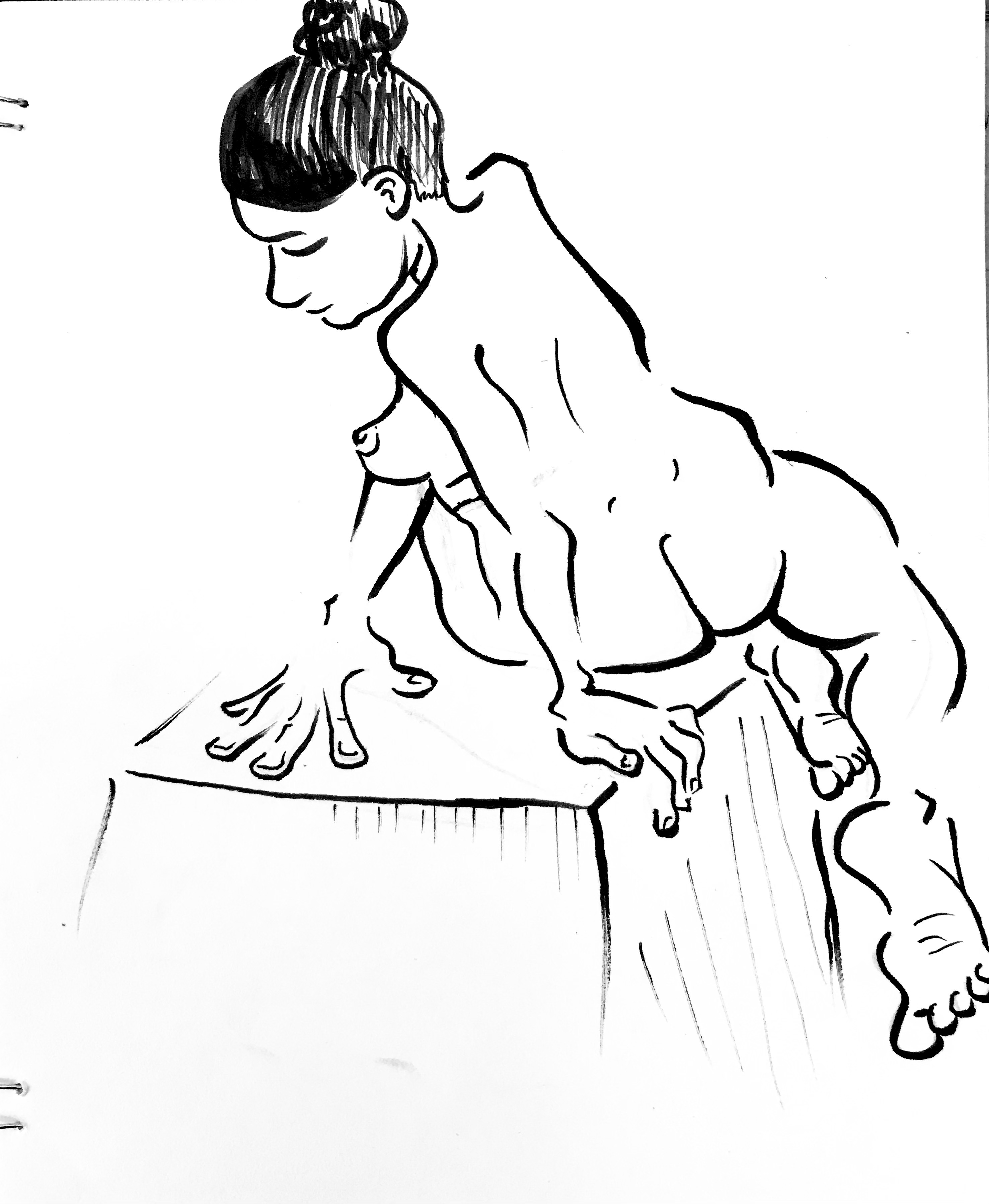 Next up is a session I did using croquis cafe’s “fast sketch” photo shuffling tool. Here I re-introduced a practice I did years back in a previous sketchbook; where I layered my drawings with different colored pencils to conserve paper/not have oodles and oodles of pages with scribbles of less than a minute. The last pose was pretty complex, so I drew it three times. The first time, I started with a red pencil, wire under-drawing and switched to graphite for the line work/shading. On the second version, I wanted to push my line work and focused on line economy. For the last version I only used the previous two drawings for reference to make a bold, stylized, open line ink sketch. Looking back, all three of them are a little too wide in the torso, but body twists and foreshortening are tricky things - even for someone who has been doing this as long as I have.